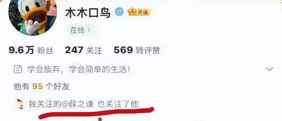 在这些七七八八的爆料里,有个网名叫“木木口鸟”的网友。这人在薛之谦的关注列表里,看样子应该是薛之谦的好朋友,所以他说的话,大家觉得可信度还挺高。