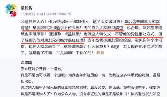 段曦的长文里,还有一段是专门夸薛之谦的。她说当年公司全靠薛之谦一个人撑着,养着一帮兄弟姐妹。等大家一个个都解约走了,薛之谦才最后一个离开。他之所以这么做,是担心自己先走了,朋友们怎么办。段曦这些话是真是假,本来也说不清。直到《我型我秀》的制作人童毅钧站出来力挺段曦,这事儿才有了点眉目。童毅钧作为当年张杰、薛之谦、段曦参加节目的幕后大佬,他说的话自然比旁人更有分量。他不光公开支持段曦,还骂“某些人”欺师灭祖,一门心思往上爬,顺便夸了薛之谦对朋友够意思,批评有些人就知道“蹭流量”。