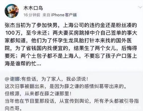 这位“木木口鸟”一上来就扔了个“大炸弹”。他说谢娜夫妇当年想要龙凤胎,还特意跑到国外的医院,又是打针又是做准备的。结果后来不知道怎么想的,又变卦了,找了家便宜的国内医院。最后龙凤胎没成,生了对双胞胎女儿。女儿出生后,户口想落在上海,但谢娜和张杰都不是上海户口,最后还是找了薛之谦帮忙才搞定的。