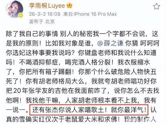 可谁能想到,她这么一闹,不光是冲着薛之谦来的,还顺带把圈里其他不相干的艺人也给扯进来了。其中有一条爆料就挺有意思,李雨桐说薛之谦以前吐槽过张杰的歌太“土”。