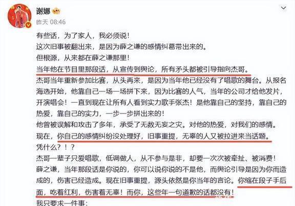 谢娜觉得,张杰这辈子就爱唱歌,平时做人也低调,根本不该被这种破事儿连累。所以她要求薛之谦好好反省自己说过的话,给张杰道个歉,别再让无辜的人替他的感情破事儿买单。谢娜这篇长文一发出来,立马就冲上了热搜。网友们一边夸谢娜够勇敢,护夫心切,一边也感慨他俩这么多年感情是真的好。但谁也没想到,接下来出场的一个人,直接把舆论风向给扭转了,本来对谢娜夫妇有利的形势,一下子就变了。